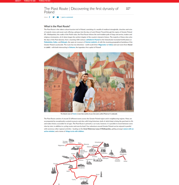 Na popularnym anglojęzycznym portalu inyourpocket.com w zakładce o Wielkopolsce znalazły się kolejne dwa obszerne artykuły, tym razem skupiające się na naszych dwóch najważniejszych produktach markowych: Wielkiej Pętli Wielkopolski i Szlaku Piastowskim. Powstały ona w ramach współpracy serwisu z Wielkopolską Organizacją Turystyczną. Podróżnicy z całego świata znajdą w nich najważniejsze informacje o szlakach i dużą dawkę inspiracji. Wcześniej na portalu znalazły się także artykuły o największych atrakcjach naszego regionu, propozycjach wypoczynku blisko natury oraz najlepszych opcjach na zwiedzanie z dziećmi.